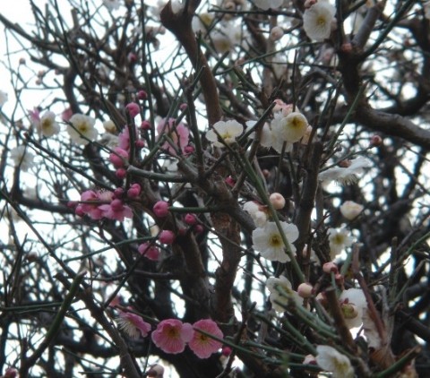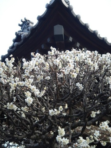 いつもきれいにされている神社を横から降りると向かいに見慣れないお寺があるのに初めて気づく。もう4年も住んでいてこんな近くにこれほど大きなお寺があるとは全然気づかなかった。ちょっと入ってみる。鐘楼があり、やはりこの境内にもポチポチと梅の木が植えられている。